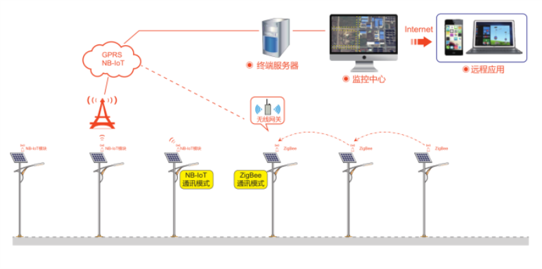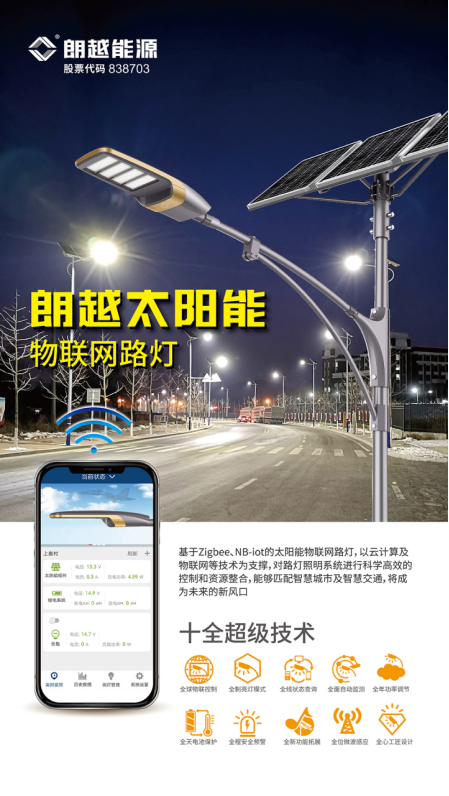 朗越能源基于Zigbee、NB-iot的太陽能物聯(lián)網(wǎng)路燈,以云計算及物聯(lián)網(wǎng)等技術為支撐,擁有“十全”超級技術:全球物聯(lián)控制、全制亮燈模式、全線狀態(tài)查詢、全面自動監(jiān)測、全年功率調(diào)節(jié)、全天電池保護、全程安全預警、全新功能拓展、全位微波感應、全心工匠設計,這些前沿先進路燈照明系統(tǒng)的技術使用戶通過手機或者電腦終端就可以對路燈的使用情況進行實時了解,實現(xiàn)科學高效的控制和資源整合,并且擁有低溫保護專利,即便是處于-50℃的環(huán)境下,朗越太陽能物聯(lián)網(wǎng)路燈仍可以正常工作,成為本溪市高新區(qū)華佗產(chǎn)業(yè)大道道亮化工程項目的最終選擇。
