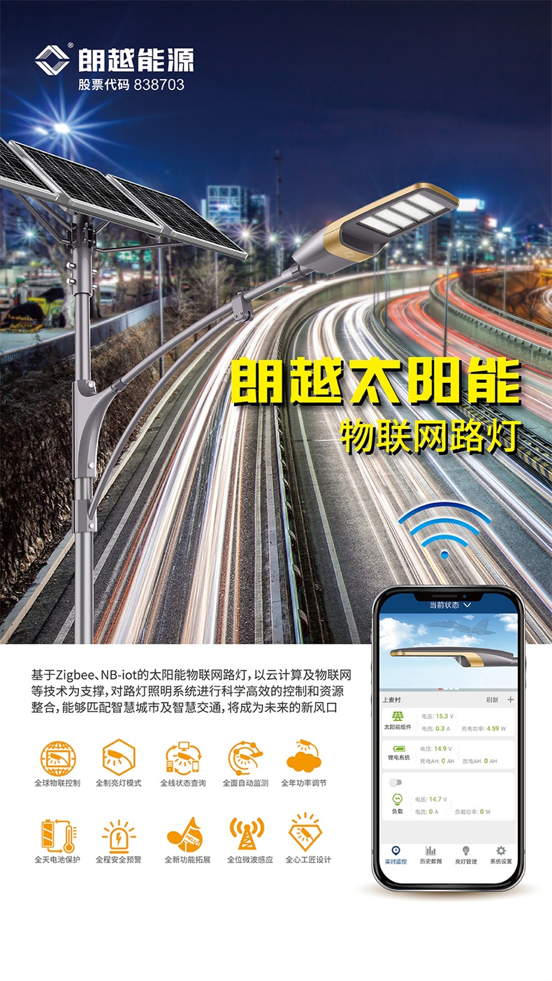 2018年10月,由朗越能源參與的鋁城大道亮化工程項(xiàng)目主干道(雙向四車道)太陽能物聯(lián)網(wǎng)路燈全部完成安裝和調(diào)試,并于2018年11月順利通過驗(yàn)收全線亮燈。
