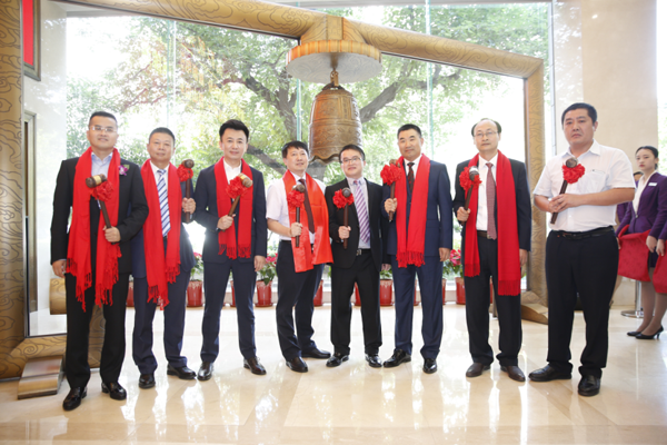 掛牌企業(yè)高管共同敲響開市寶鐘,并在寶鐘和財富大門前合影留念。